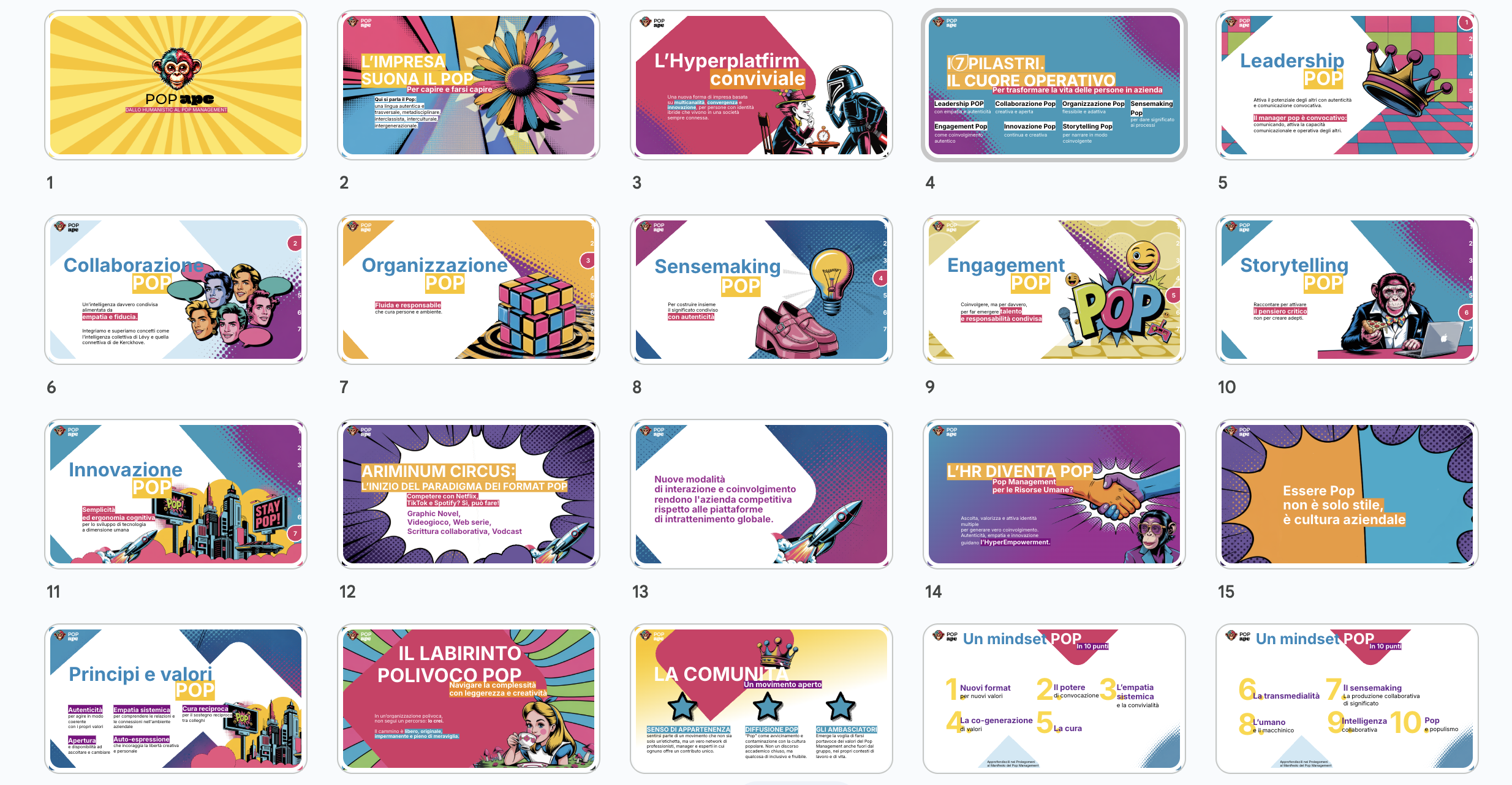 “Essere Pop nelle presentazioni” significa comunicare valori autentici – in cui crediamo e che applichiamo e perseguiamo in prima persona – e creare relazioni reali e durature con il pubblico. Come ci ricorda il Manifesto del Pop Management, per competere nel mondo di oggi la comunicazione aziendale deve adottare i codici della cultura Pop (empatia, autenticità, ascolto, immaginazione). È questo il nuovo potere delle Presentazioni Pop.